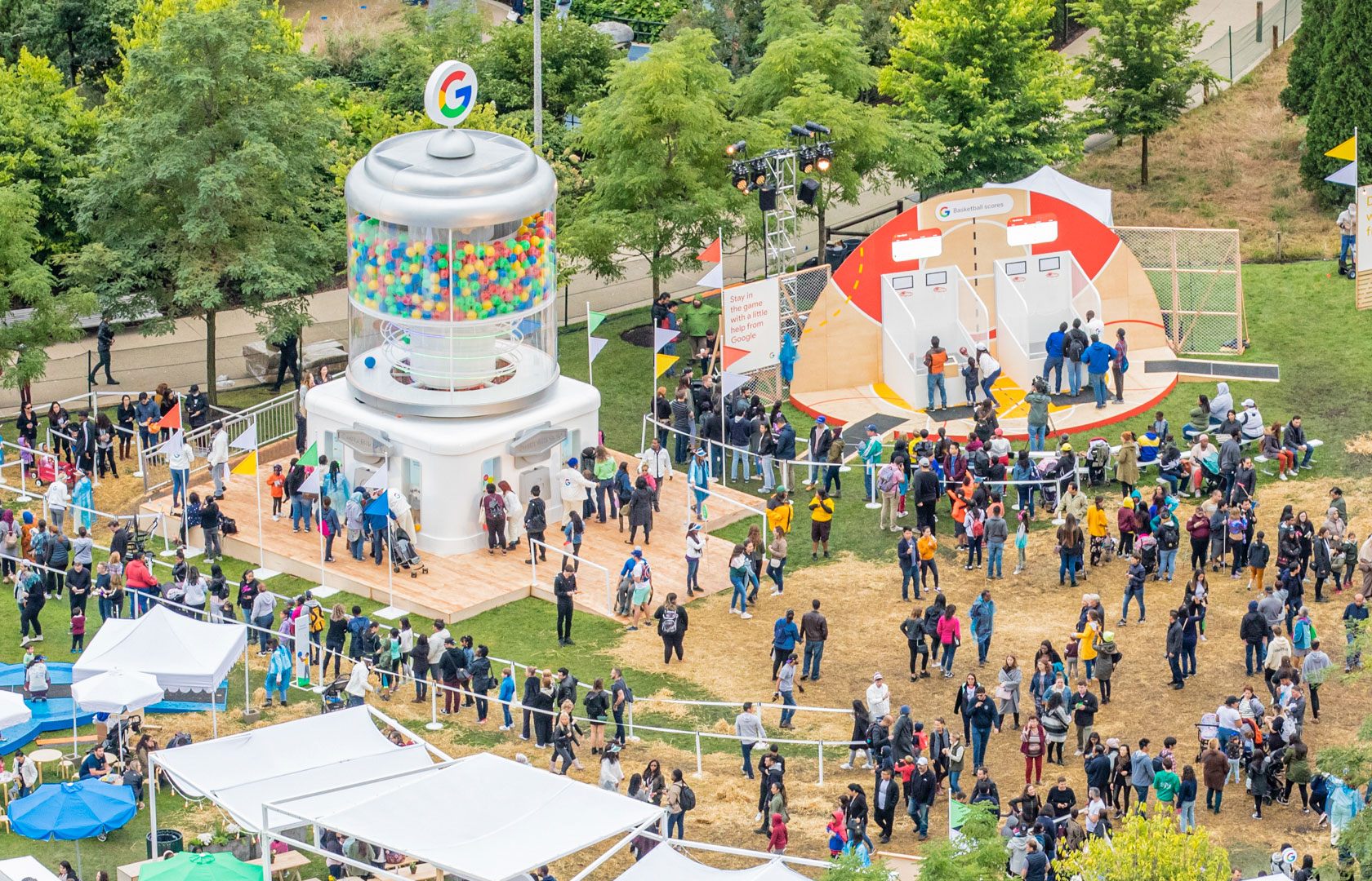 ︎ September 2019, Chicago Suprise and delight overload! For one weekend on Chicago Google setup a giant gumball machine dispensing “a little help from Google.” Creative tech touchpoints include LED signage, outdoor monitor build for a pop-a-shot basketball game, and kiosks of Google Pixel 3 XL’s using AR technology for the childrens undersea experience.